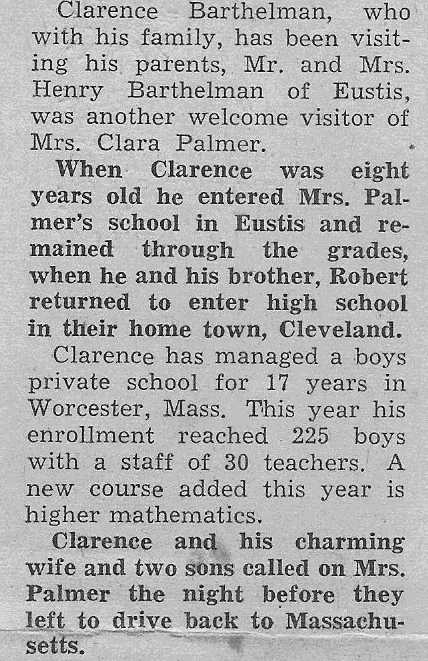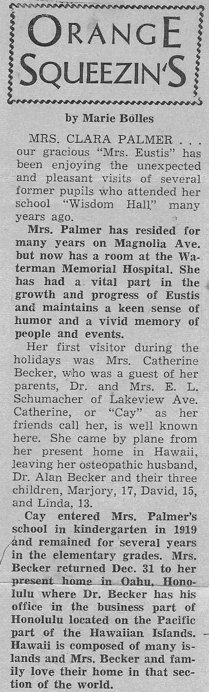 ![]() ![]() ![]() ![]() Clara was schoolmistress of Wisdom Hall catering to northern children here for the winter months. They brought their books with them and she tutored them. Some Eustis children also ![]() The building in the background is Wisdom Hall. Pictured are her students. She loved her church, St. Thomas Episcopal Church in Eustis, and donated her school house to them located in the 500 block of Lemon Ave. A truck pulled it along while big logs were placed underneath for it to roll on. The building became the Parish Hall for the church. Now it houses their library and a meeting room with kitchen. The last 2 rooms were added on later. In her later years she resided in room 445 at Waterman Hospital. The Fountain Inn Hotel had been given to the Lake County doctors group and they made the top two floors into a hospital retaining the lower two as hotel and stores as before. The room was reserved for the family needs by her brother, Frank Dan Waterman. She brought to the hospital her favorite chair, a desk and chair, and her bureau. plus other keepsakes. The room was a large corner room with lots of space. After her death it became a four bed ward. She wrote an autobiography before her death in 1961 which is reproduced here from p. 10 Clara Dell Waterman, 1867, after the death of her father in 1883 went back to Altorff and taught in the school during the two fall months of November and December of 1884, with payment of $28.00 per month, and the three winter months of January, February, and March of 1885, with payment of $100 per season. Upon her return to Kankakee on April 1, 1885, she was asked by the school board to substitute for a teacher who was sick for the rest of the school year. At this time, June 15, the board engaged her to teach another year, which lengthened into 10 years more in the Kankakee Public Schools. On October 28, 1897, she married Charles Palmer, who died on September 2, 1902, leaving her with Frank, an eight month old son to care for, and also Clifford Palmer, a 14 year old stepson. In September, 1906, Mrs. Clara Palmer, and her son Frank, now four years old, moved to Eustis. There Mrs. Palmer opened the first kindergarten in Eustis, on October 6, 1906, in Wisdom Hall, built by her brother Frank Dan Waterman. This Wisdom Hall was to be used by Mrs. Palmer's Pupils. In October, 1907, Mrs. Palmer added to the kindergarten a Tutoring School, where pupils could continue using the text books of their home school, and when they returned in the spring to their own school, they could resume studies with their own classes. These two schools were in operation until June 15, 1927.